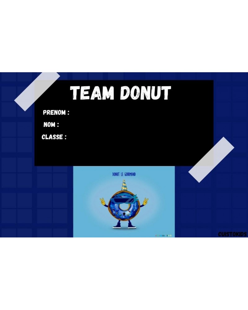 Étiquette scolaire personnalisée Cuistokids à l’effigie de Donut le gourmand. Fichier PDF à télécharger et à imprimer.